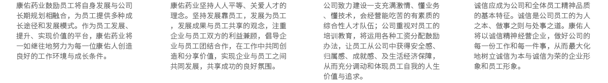 康佑藥業(yè)秉承以人為本的人才理念,堅(jiān)持用廣闊的發(fā)展前景凝聚人,用美好的事業(yè)目標(biāo)激勵(lì)人。 通過(guò)建立科學(xué)有效的人才機(jī)制,營(yíng)造積極良好的人才成長(zhǎng)環(huán)境,致力于為每一位員工提供一個(gè)充分施展才華的舞臺(tái),并通過(guò)不斷創(chuàng)造個(gè)人的發(fā)展機(jī)會(huì),讓各類人才都擁有獲取成功、實(shí)現(xiàn)自我價(jià)值的機(jī)遇和平臺(tái)。在用人上,康佑藥業(yè)堅(jiān)持尊重人才、尊重創(chuàng)造的理念,不唯學(xué)歷重能力,不唯文憑重水平,用人看業(yè)績(jī),看能力,看潛力。